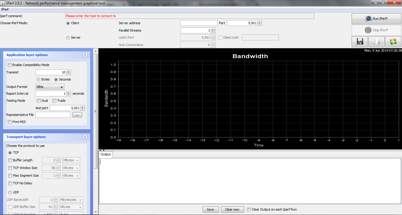 – No PC cliente, à frente do Client escrevemos o IP do nosso servidor. À esquerda, podem mudar o Output Format para Mbit/s e o tempo de teste (por defeito 10seg), caso o desejem. Clicam em Run JPerf! e aguardem o fim do teste.