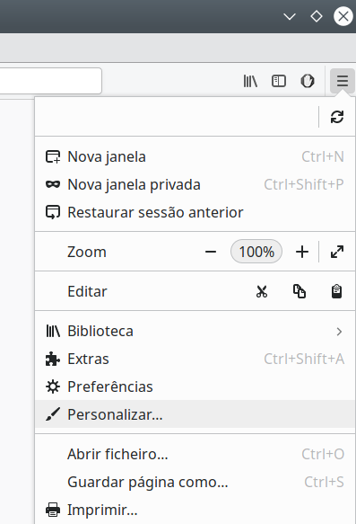 1 – No firefox clicar no botão de menu e escolher “Personalizar”